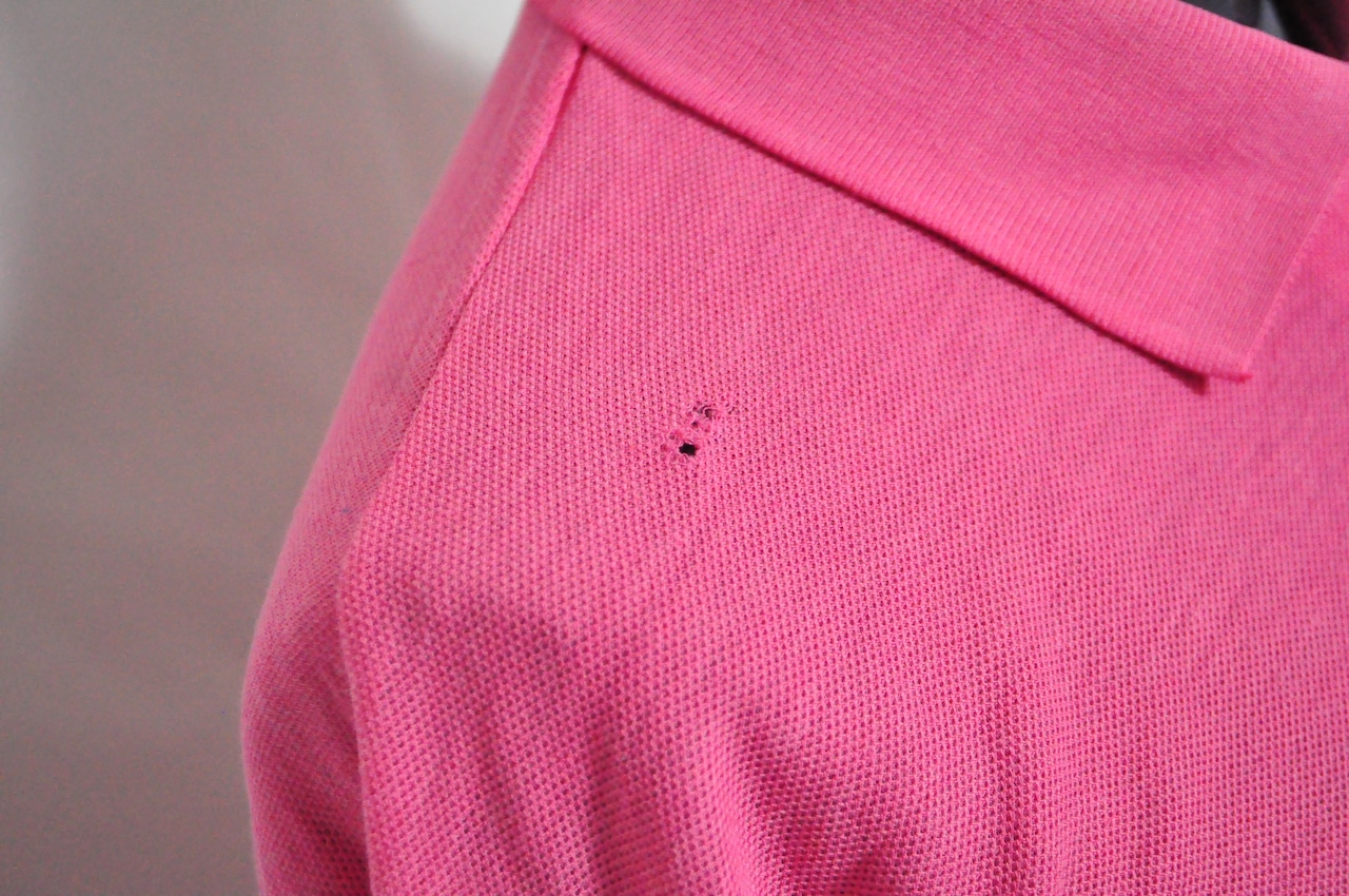 前側右肩付近に穴、ステッチの切れ