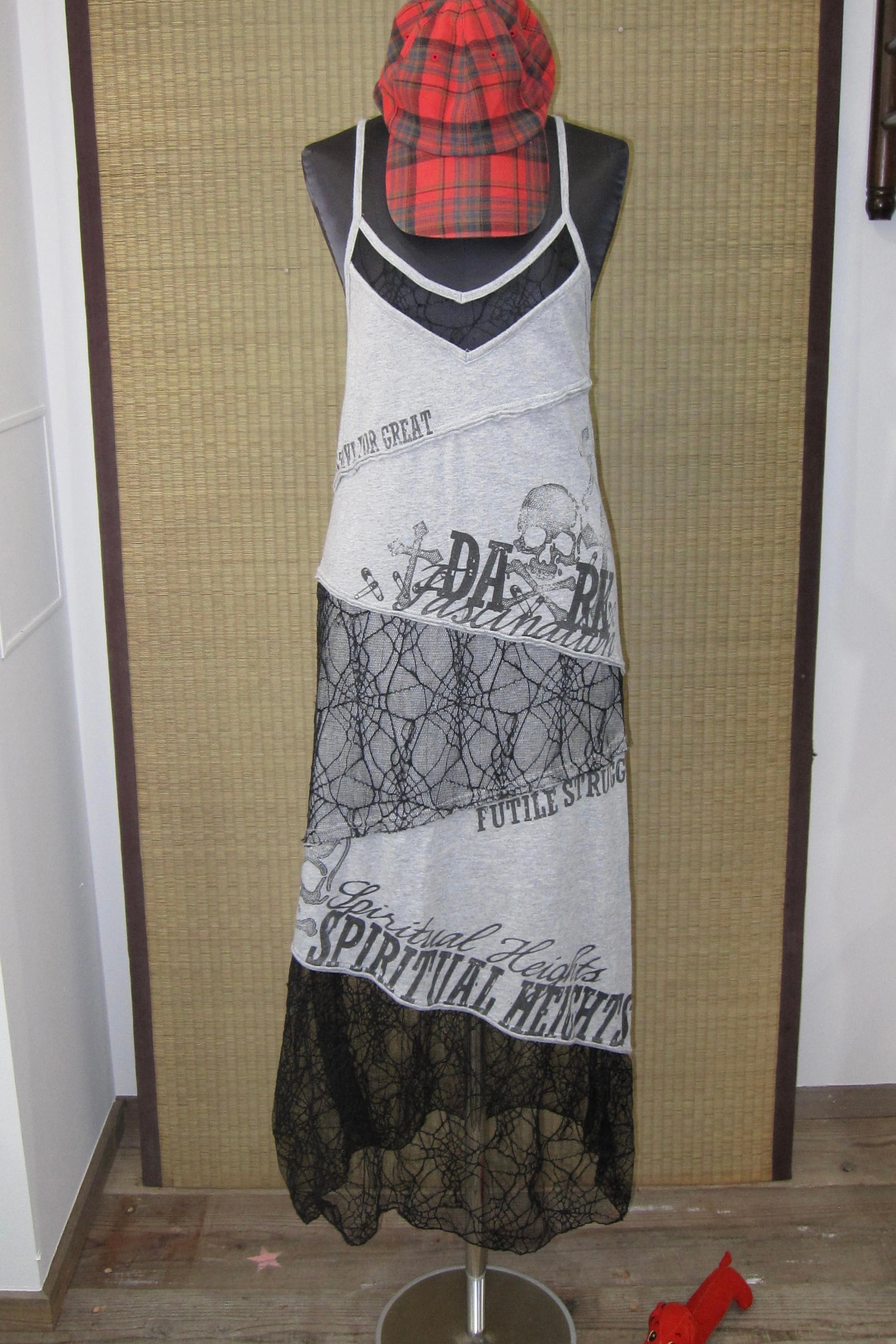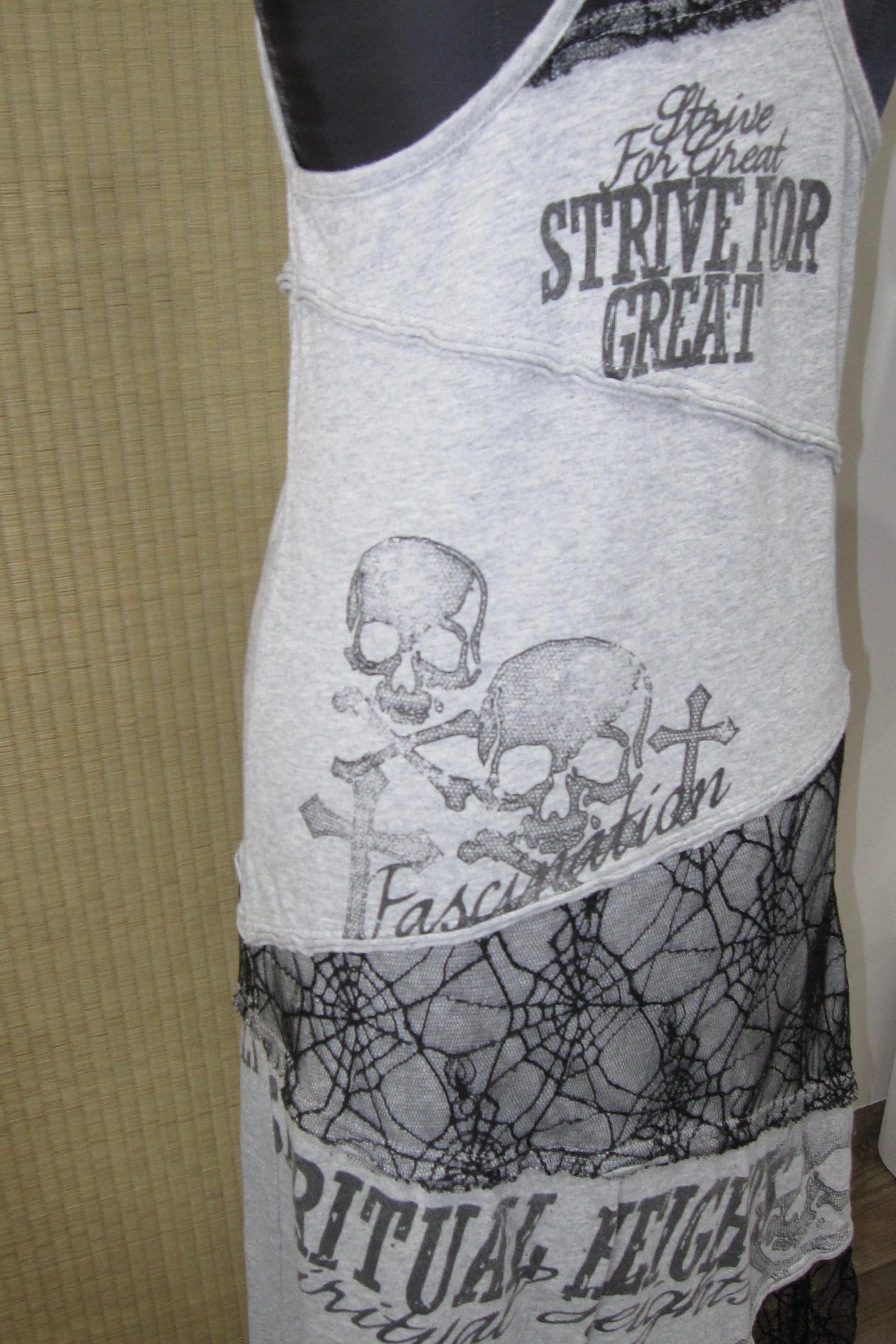 ♩.♪⭐︎スカルとスパイダーウェブを纏ったグレーのキャミワンピ。レースの透け感とモチーフの組み合わせが、退廃的でロマンティックなムードを生む♩.♬*