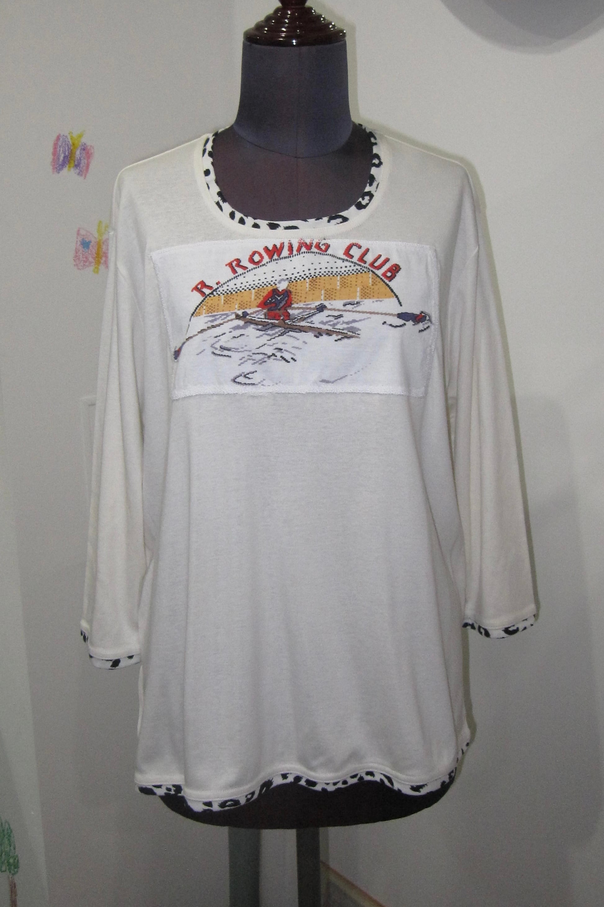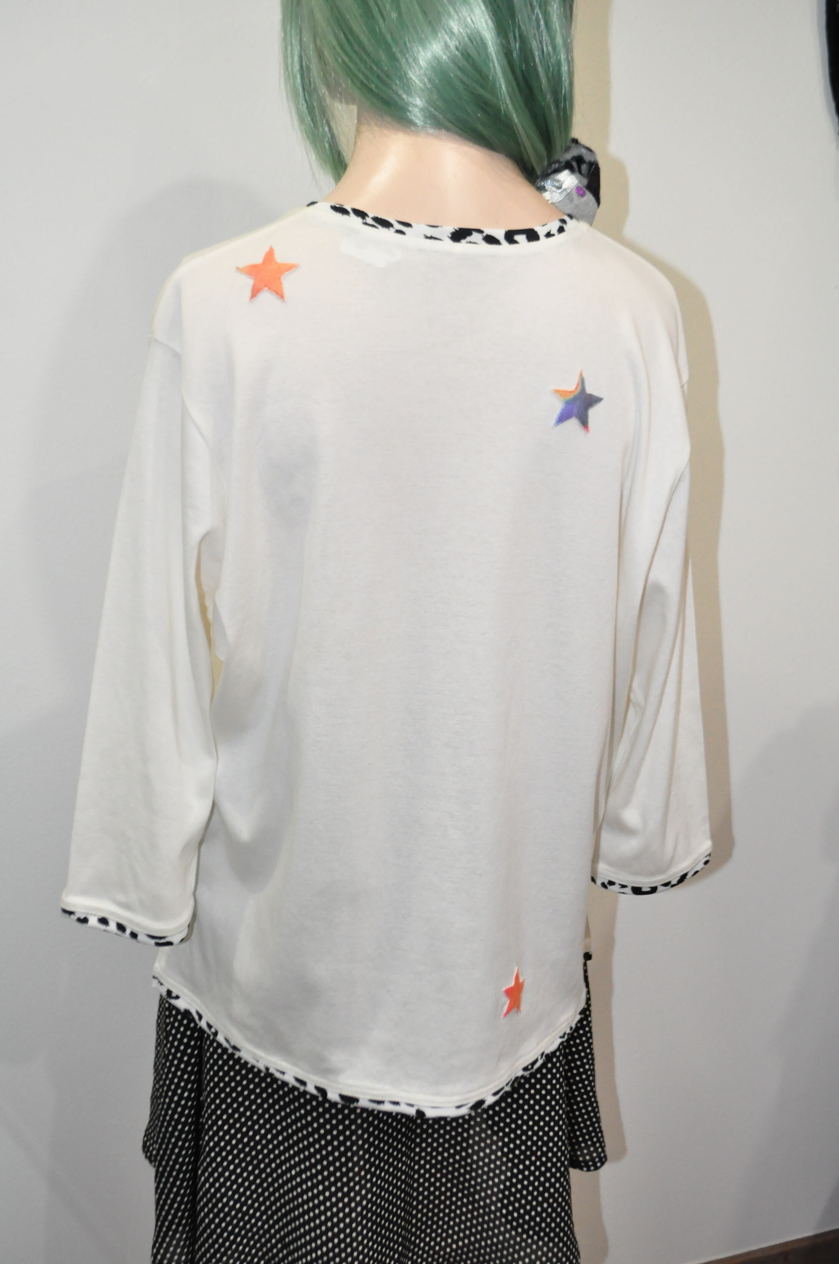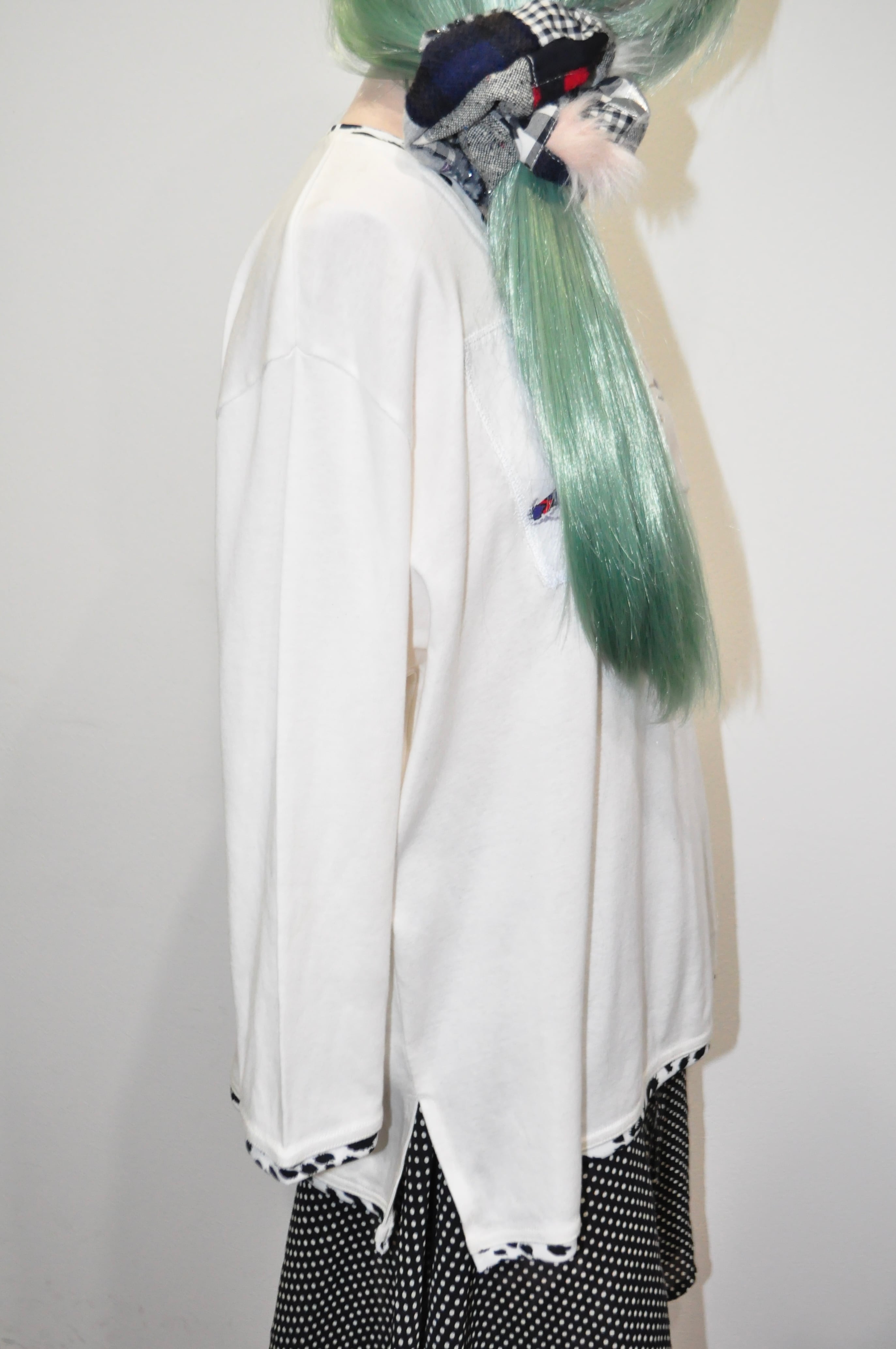 胸のプリントは古着をリメイクして縫い付けてあるから、世界で1枚だけのデザインなの〜