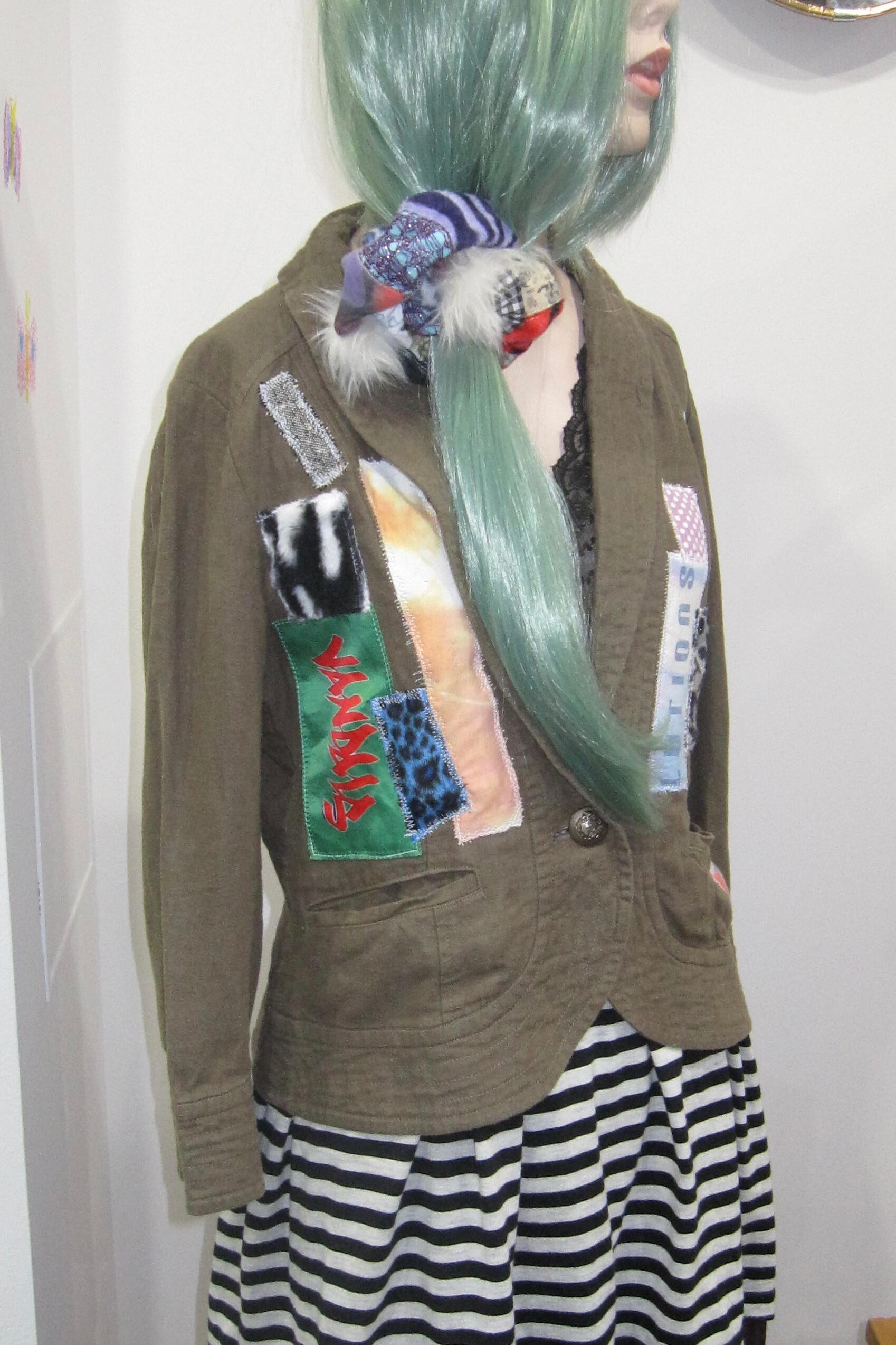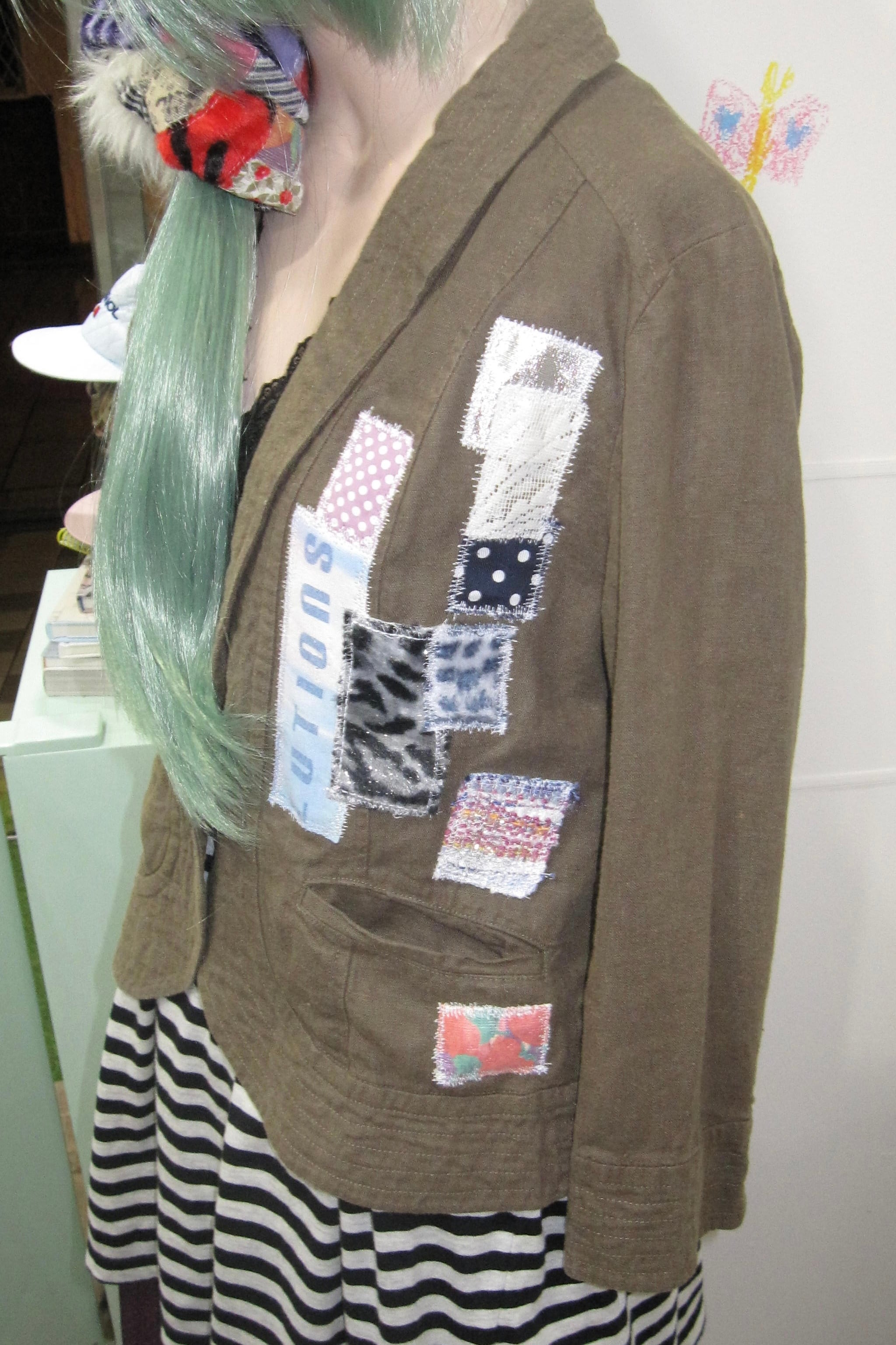 どれみ「七分袖のカーキジャケットをキャンバスにして、いろんな布のかけらをちくちくぬいつけたの꒰✩'ω`ૢ✩꒱