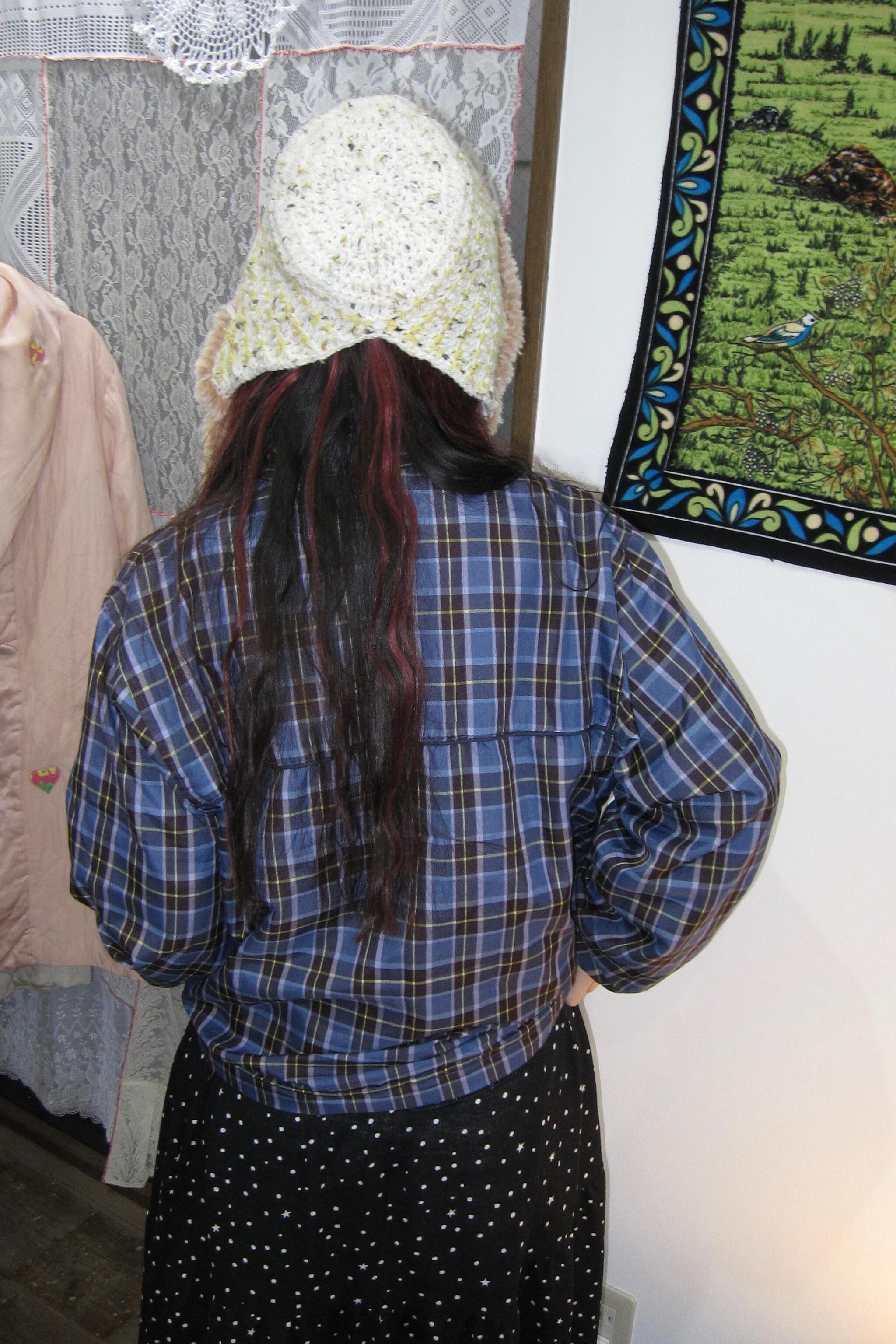 どれみ「ブルーの生地に、小豆みたいな深い赤と、ふわっと灯りみたいな黄色のチェックが並んでてね、まるであったかいお菓子と光をひとつに混ぜたみたいなの。さらっと羽織るだけで気分がひとつ明るくなるジャンパーなんだ。」