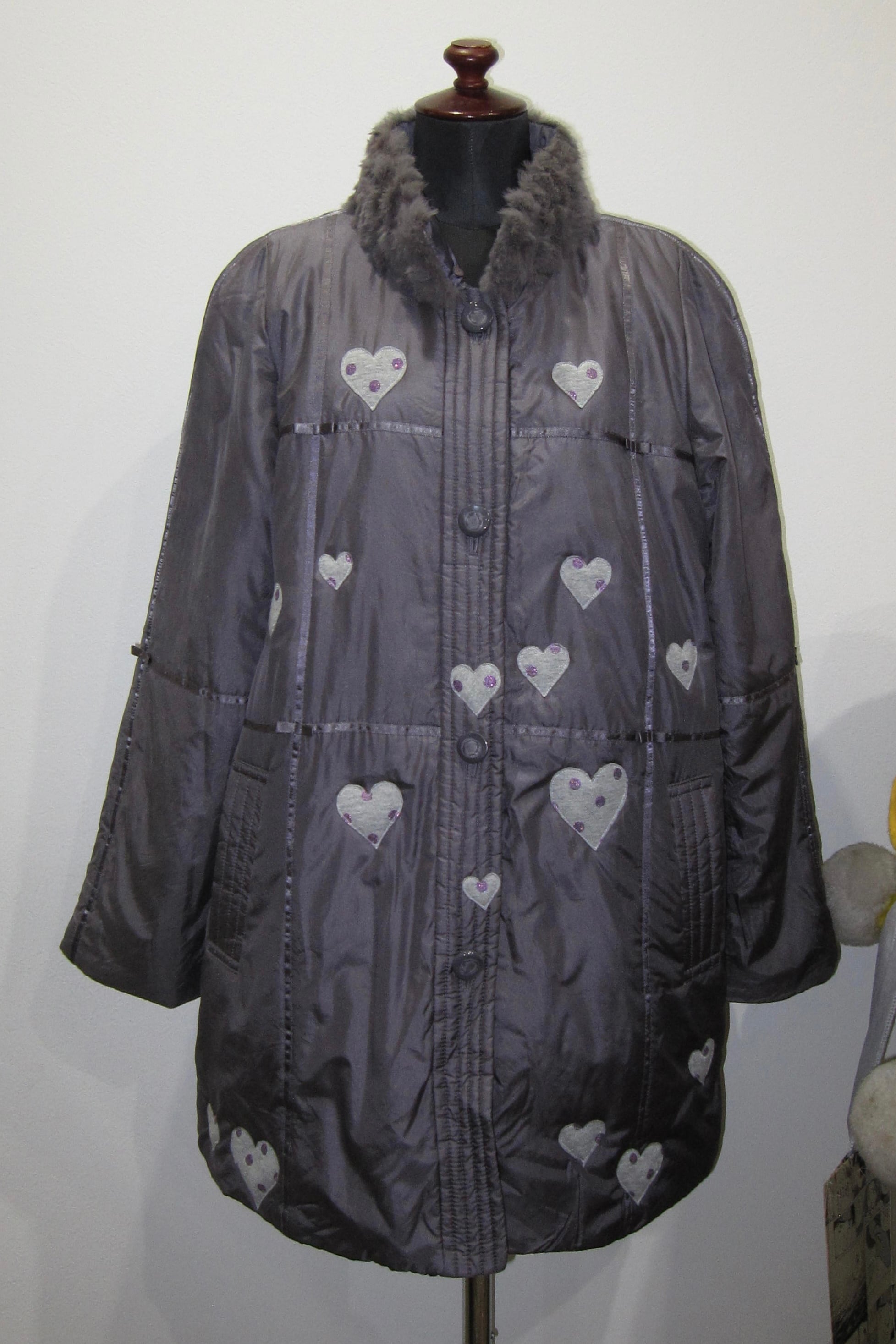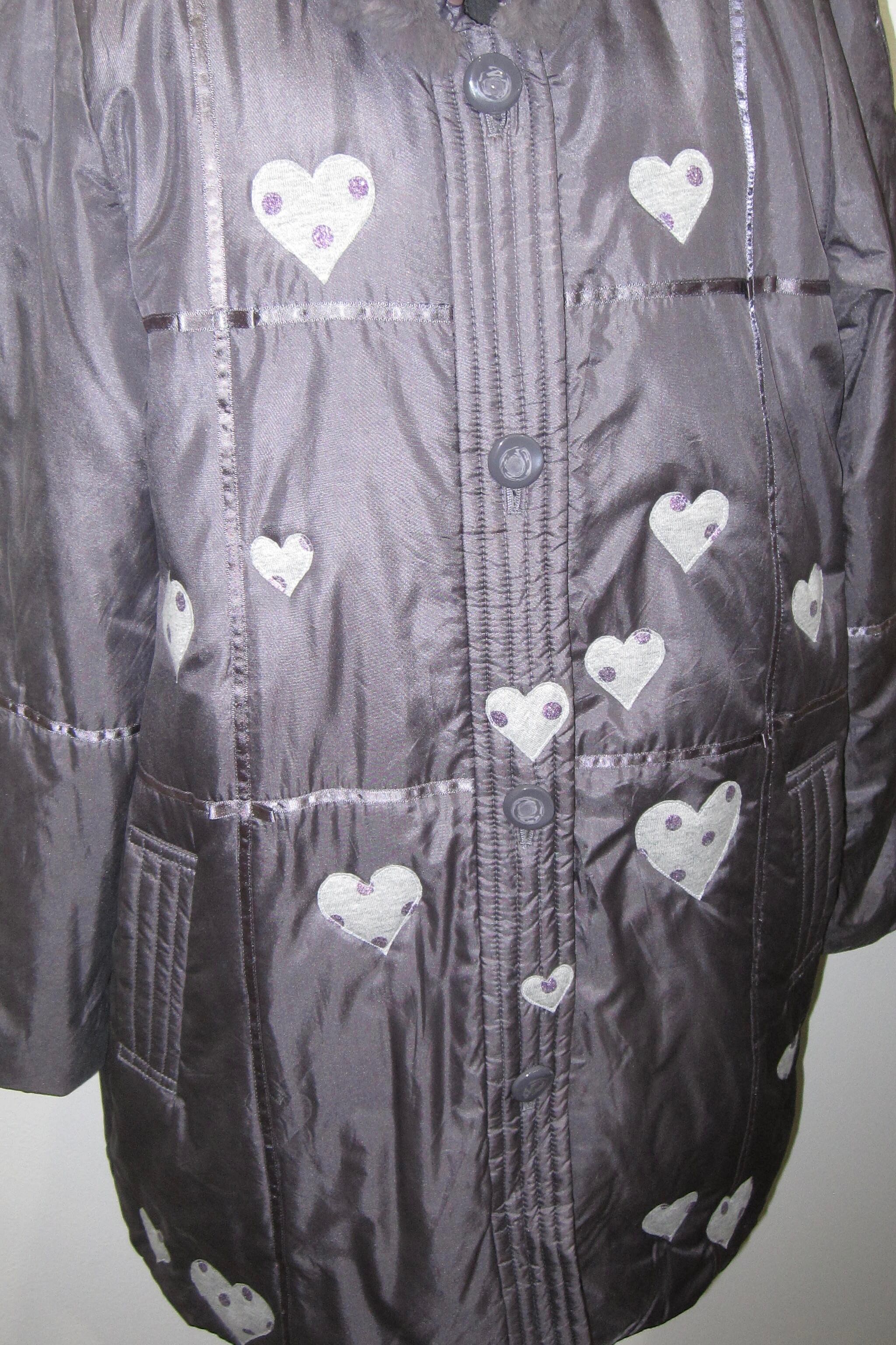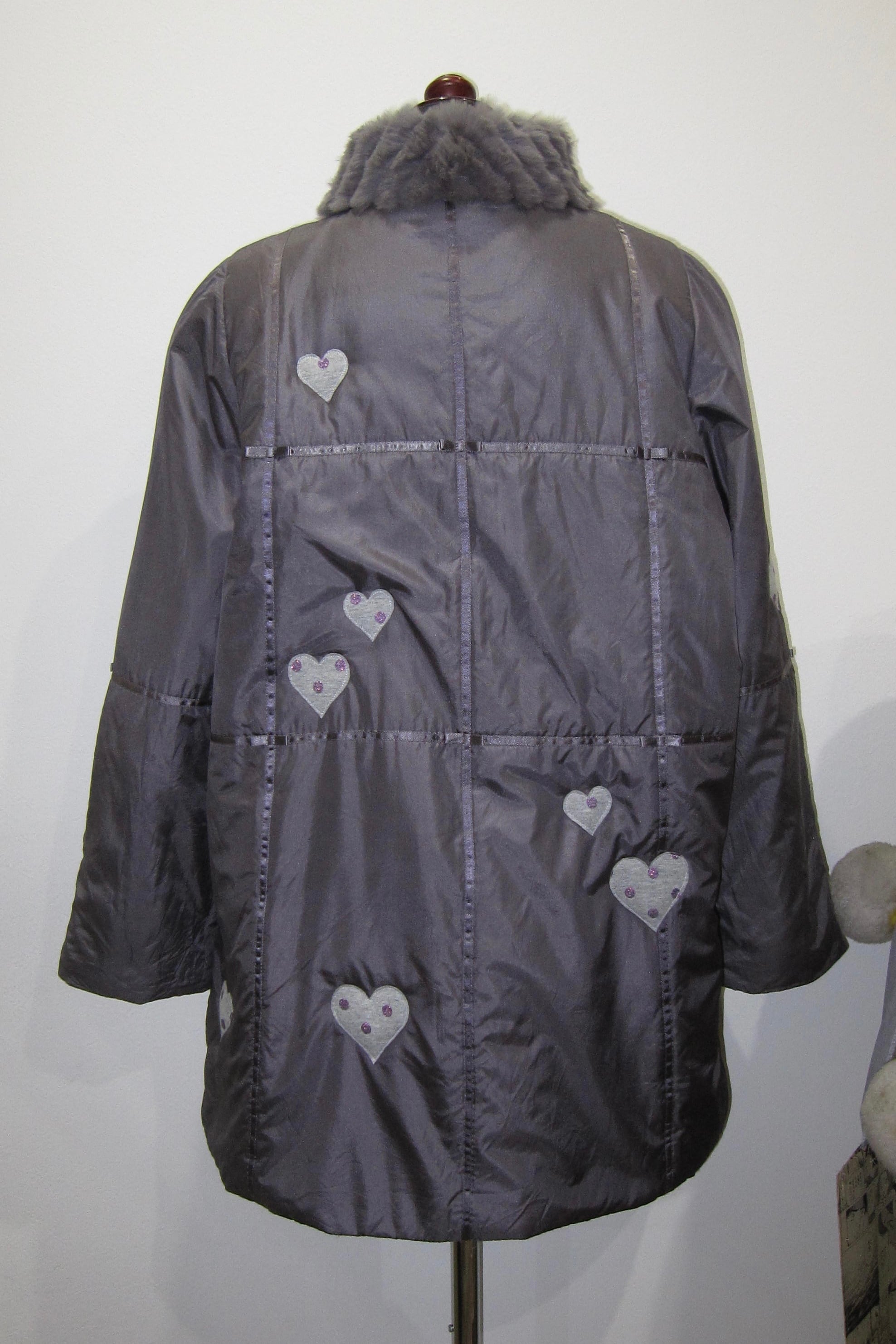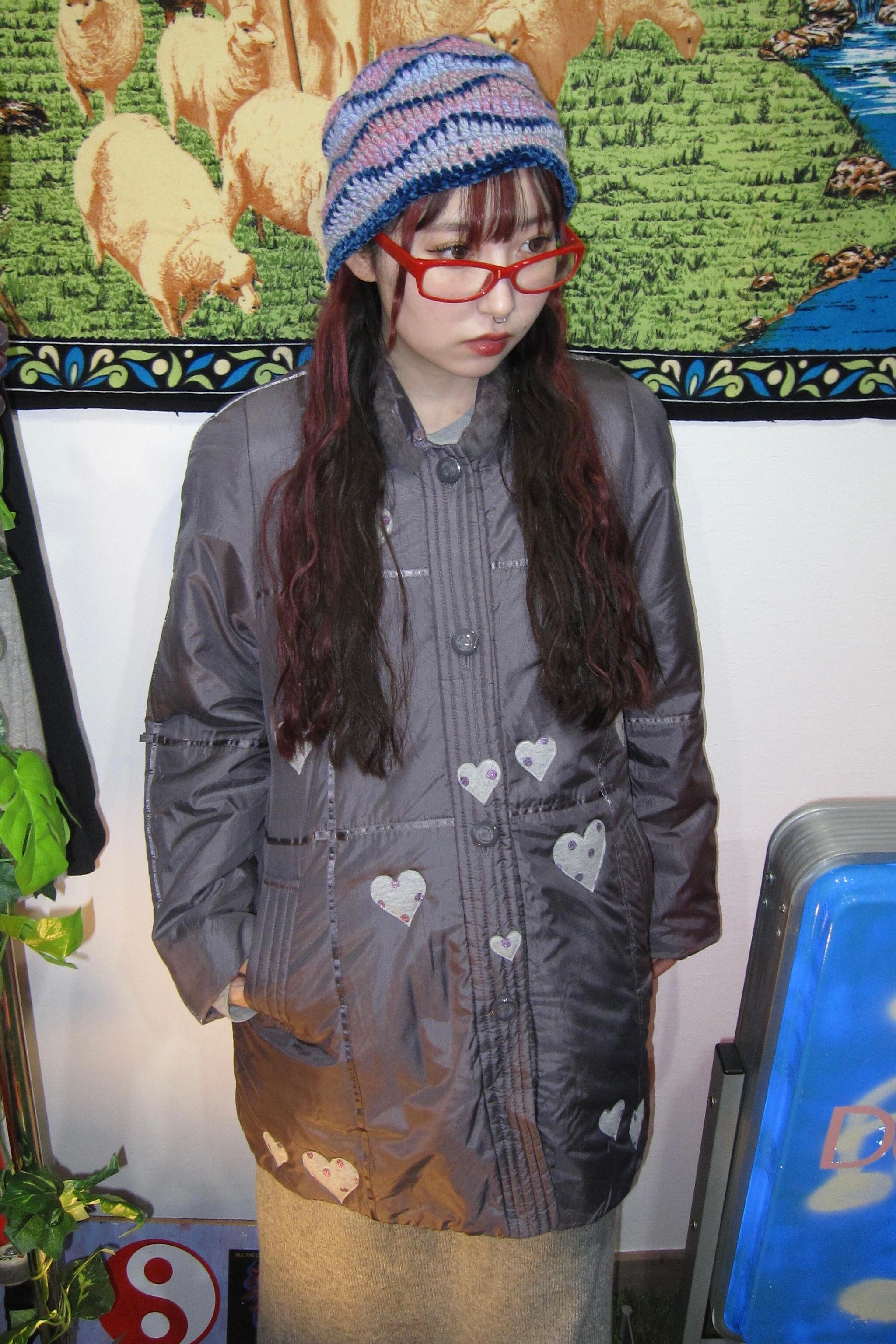 襟のファーがやわらかくて、全体には小さなドットのハートを縫い付けてるよ。