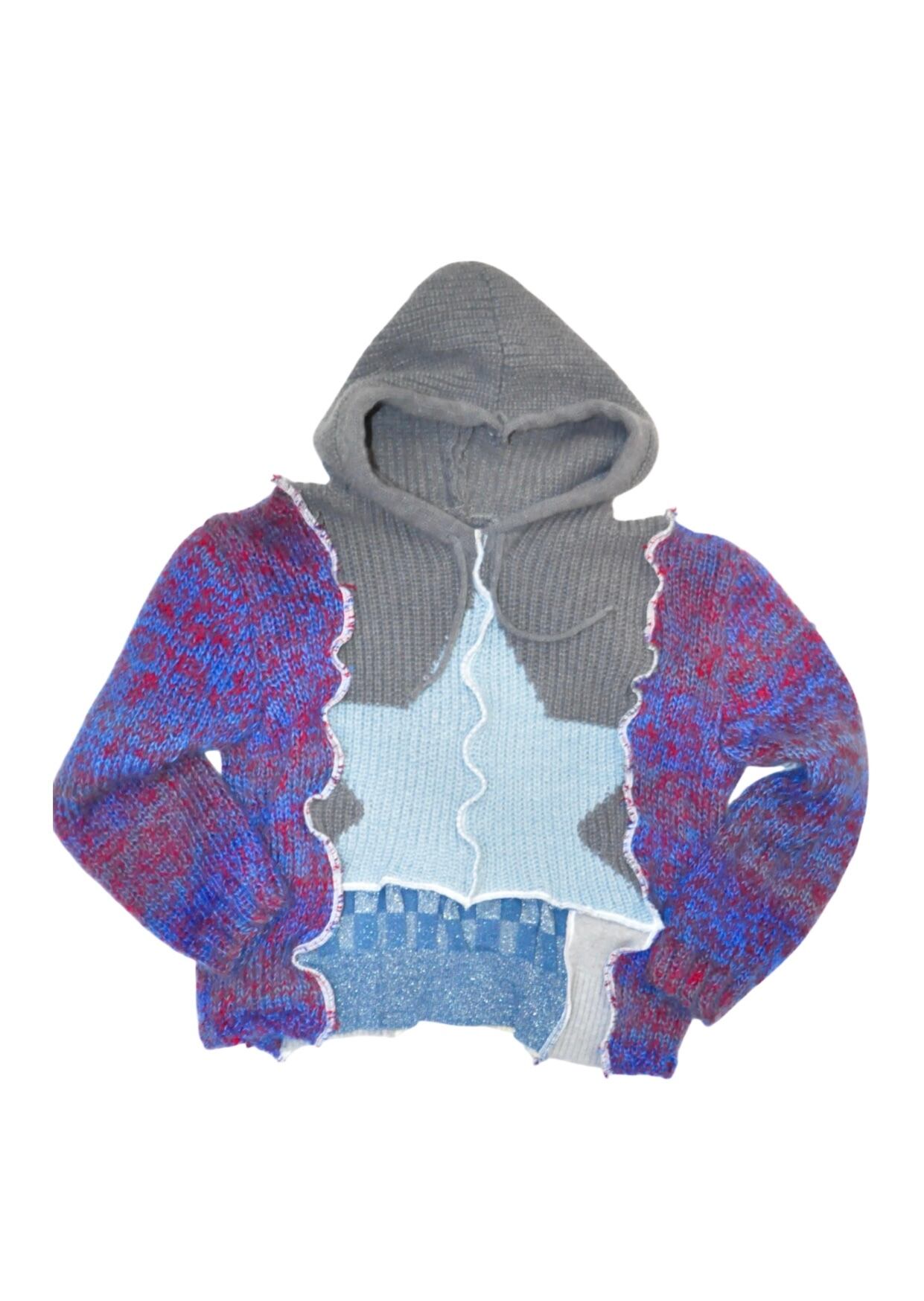 どれみ「グレーのフードニットをベースにして、赤と青のお袖をくるっとつないだよ(⊃ ॑꒳ ॑⊂)