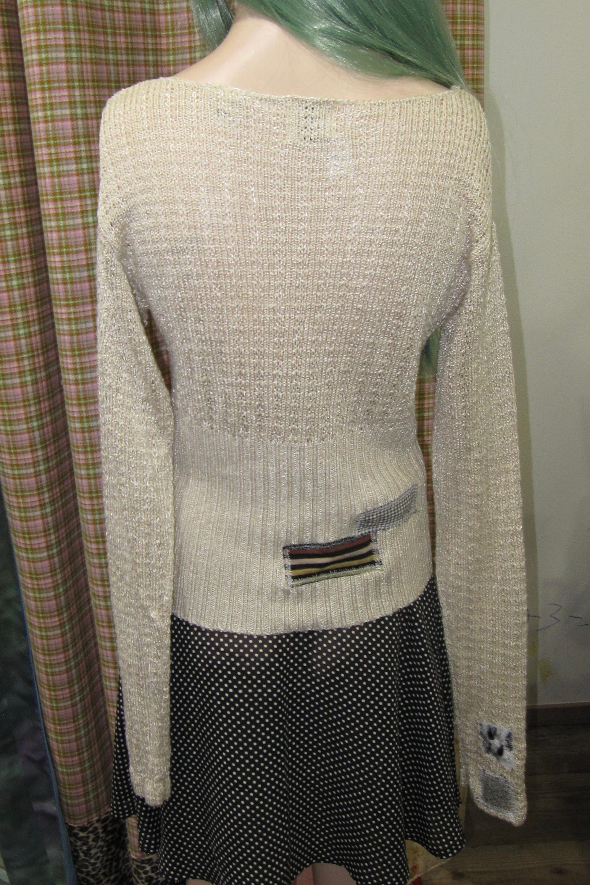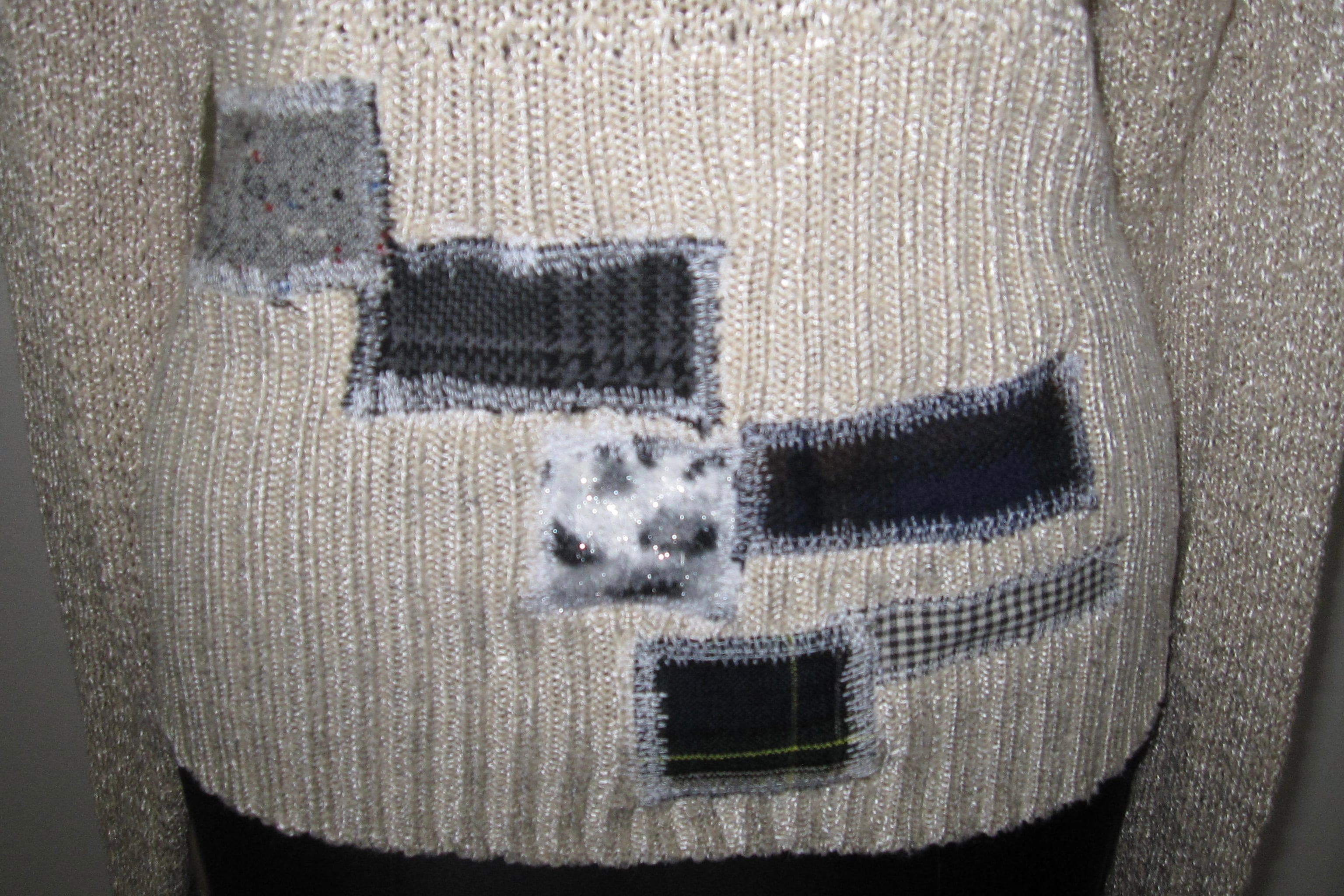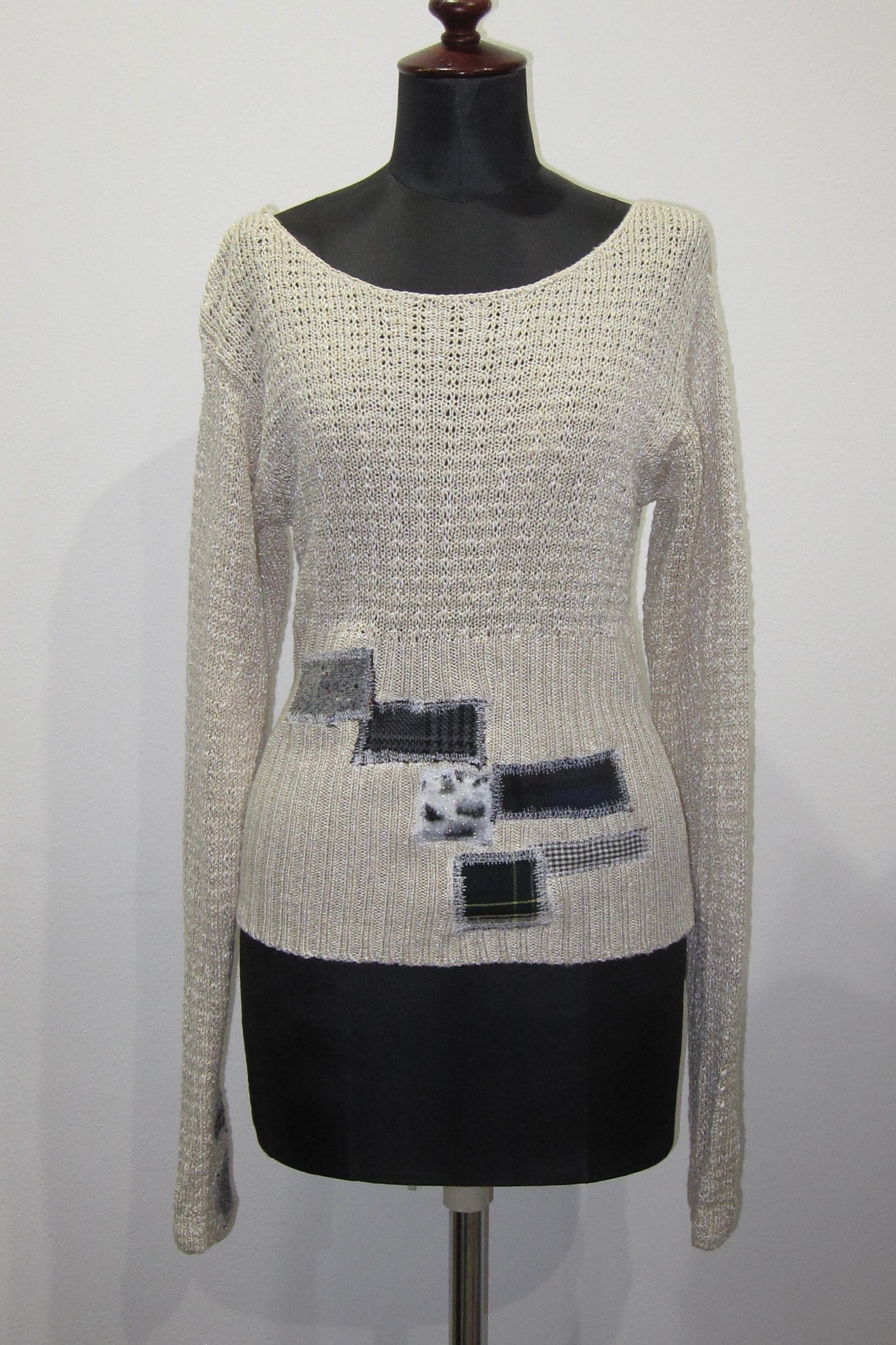 「広めの襟がゆるっと可愛いオフホワイトのニットに、黒のパッチワークを合わせたよ。