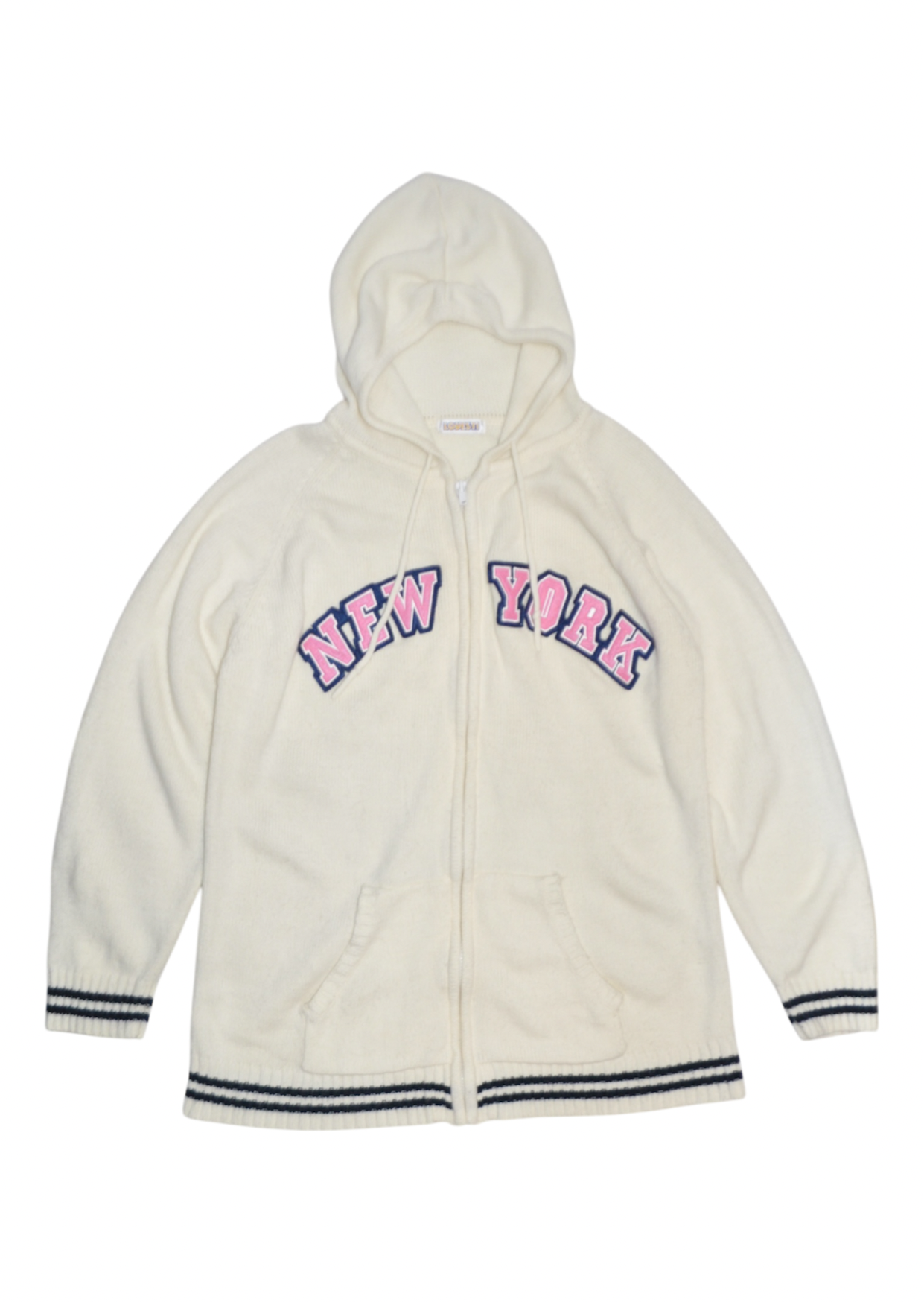 どれみ「ジップアップのニットに、胸元のピンクの“NEW YORK”。