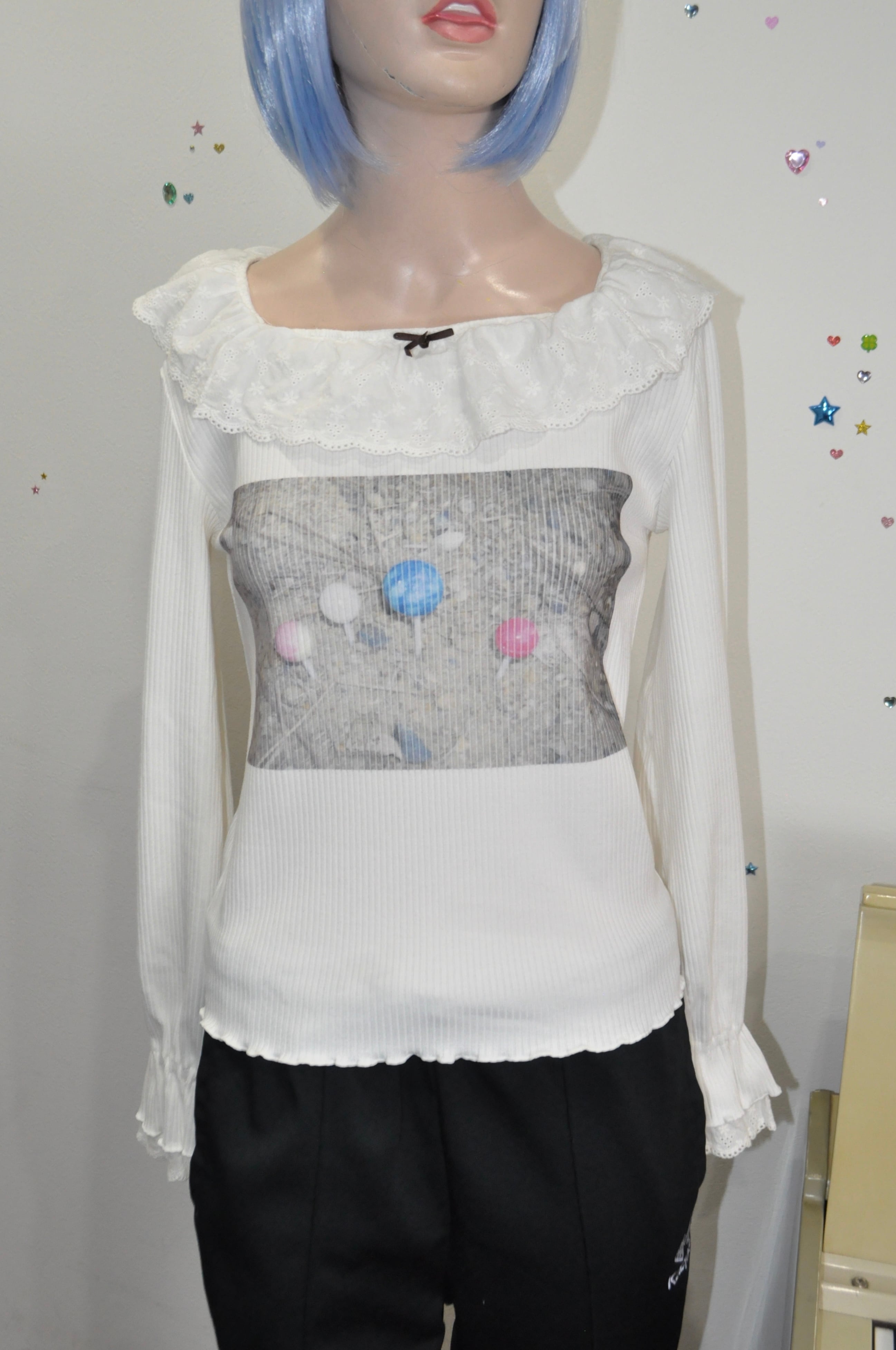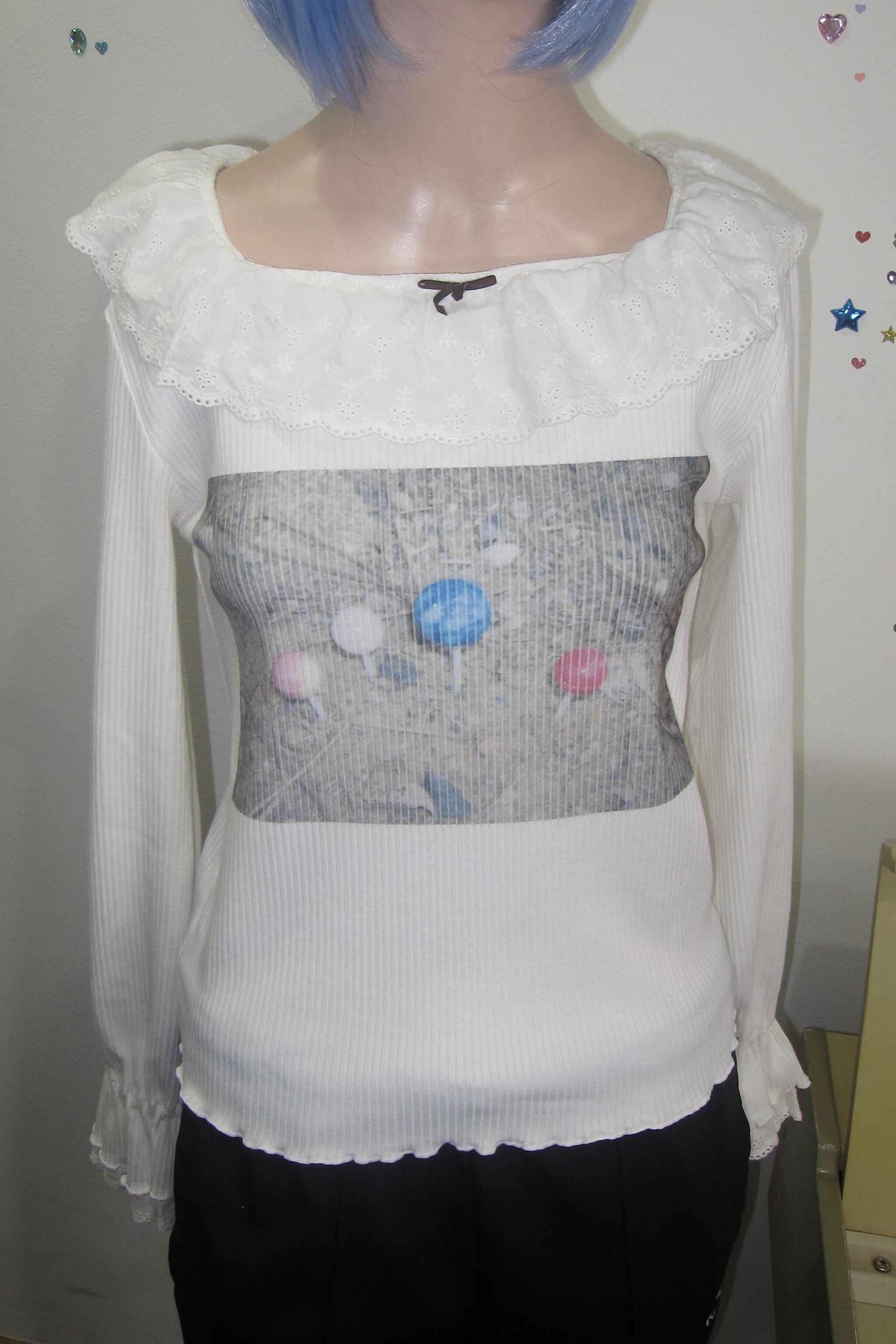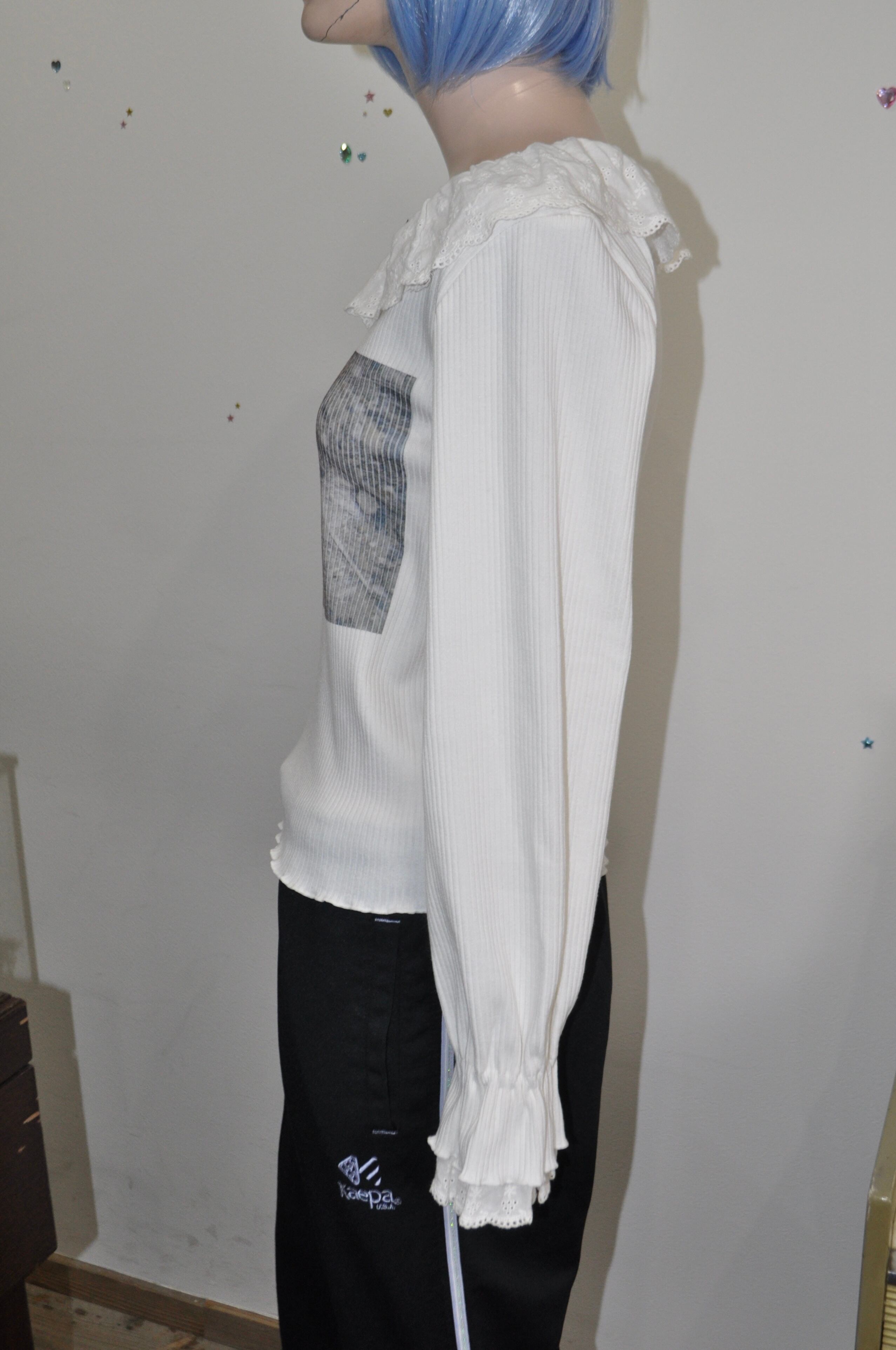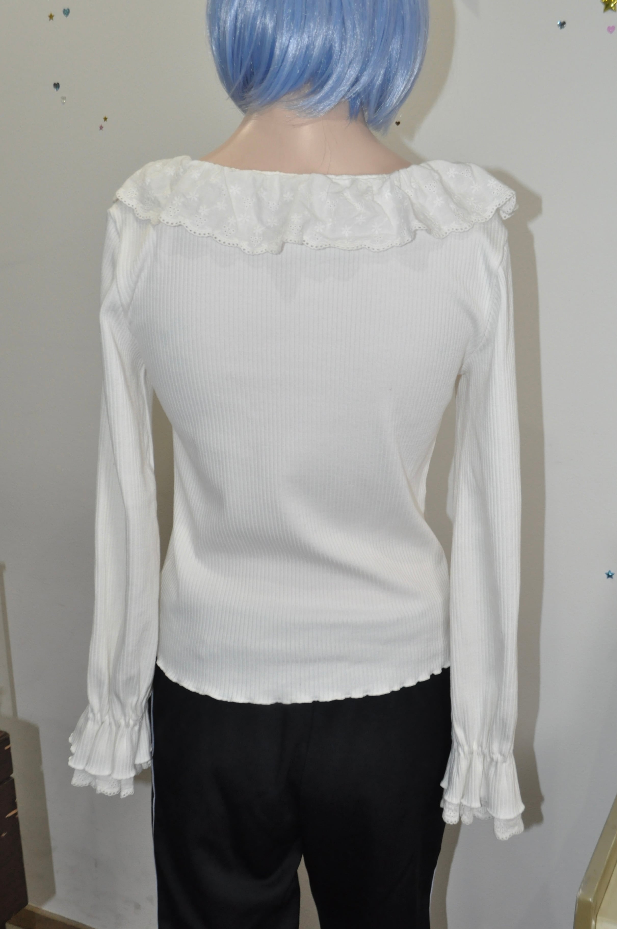 どれみ「白いニットに、ふわっとしたフリルの襟と袖口。
