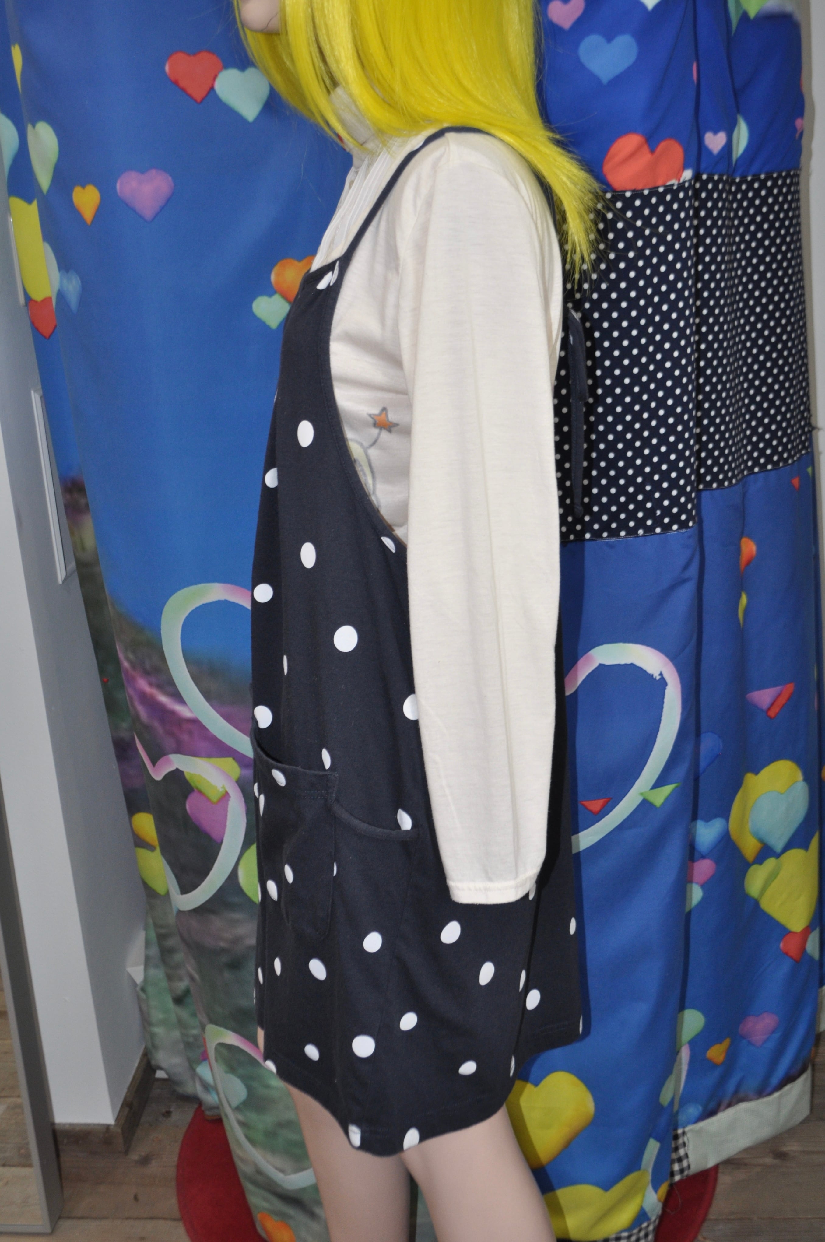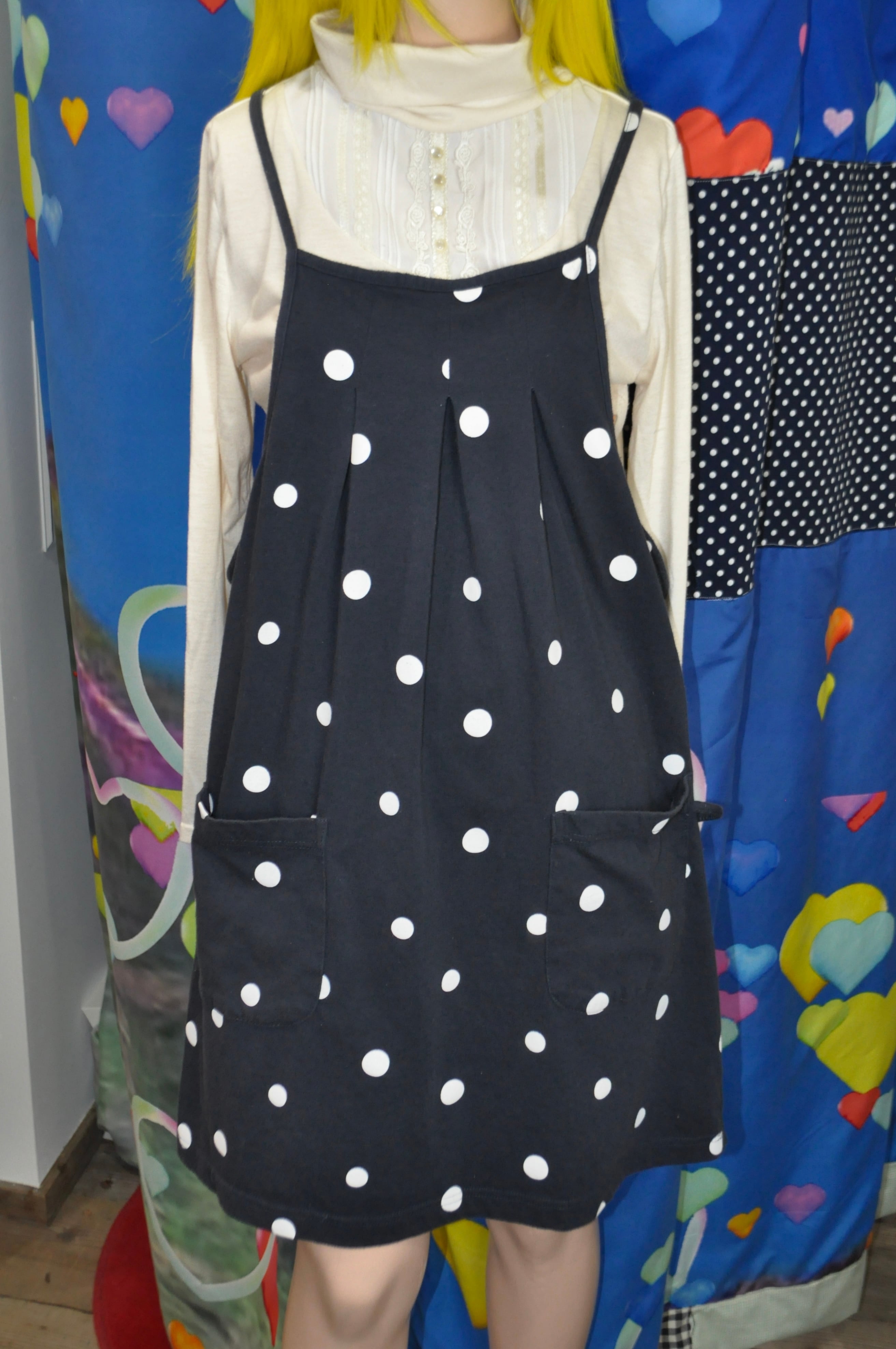 どれみ「深いネイビーのドットドレス。
