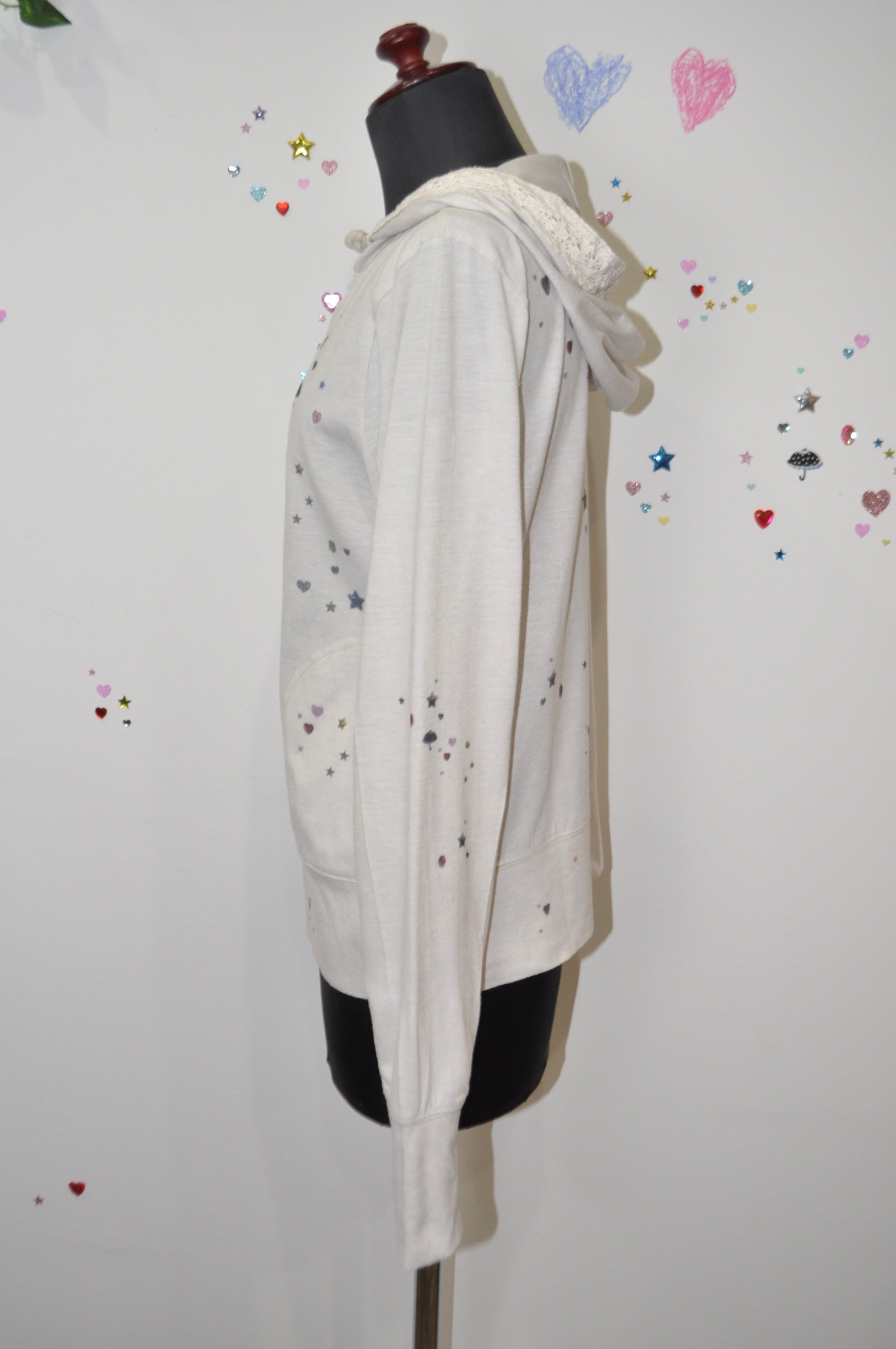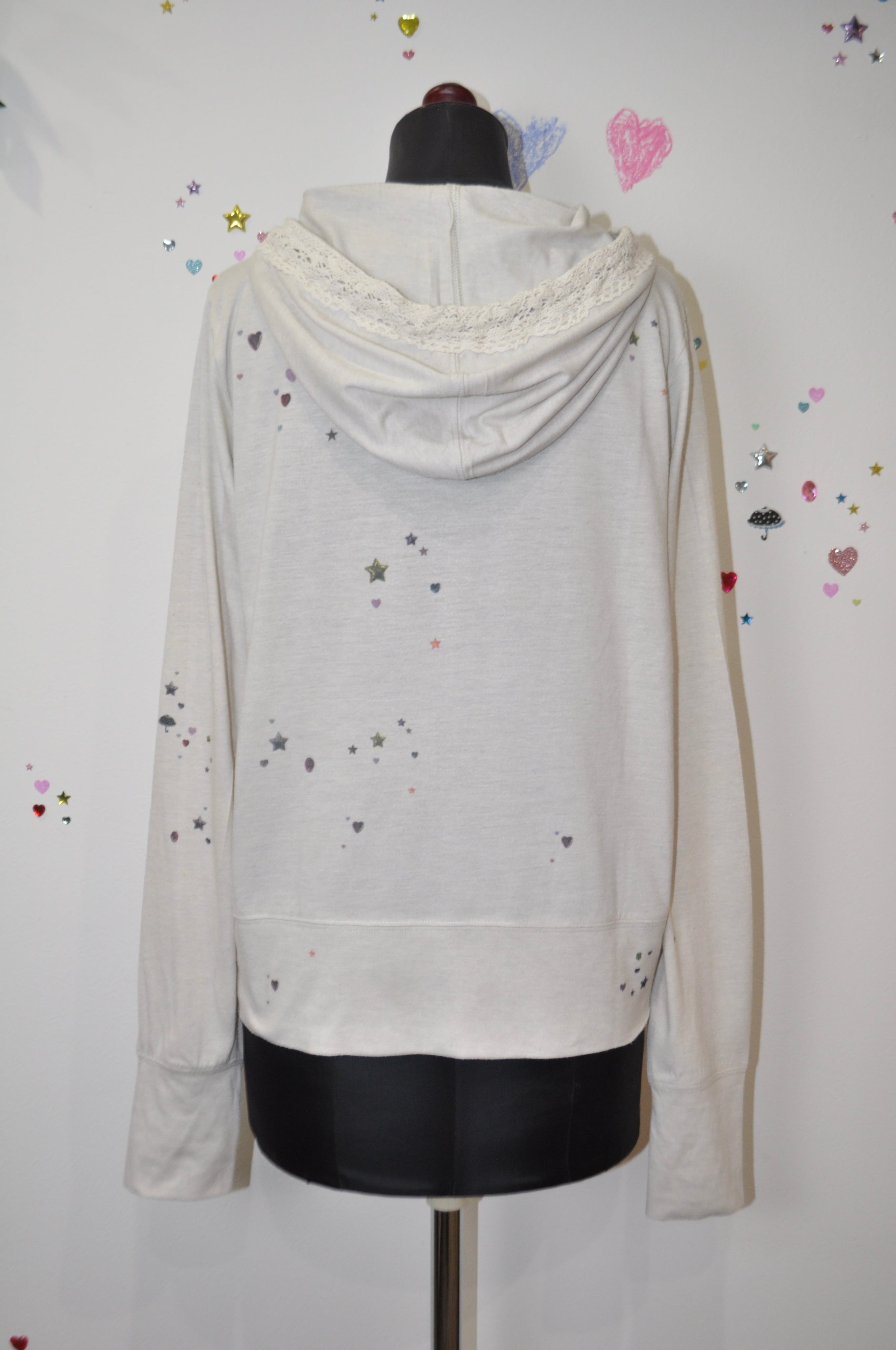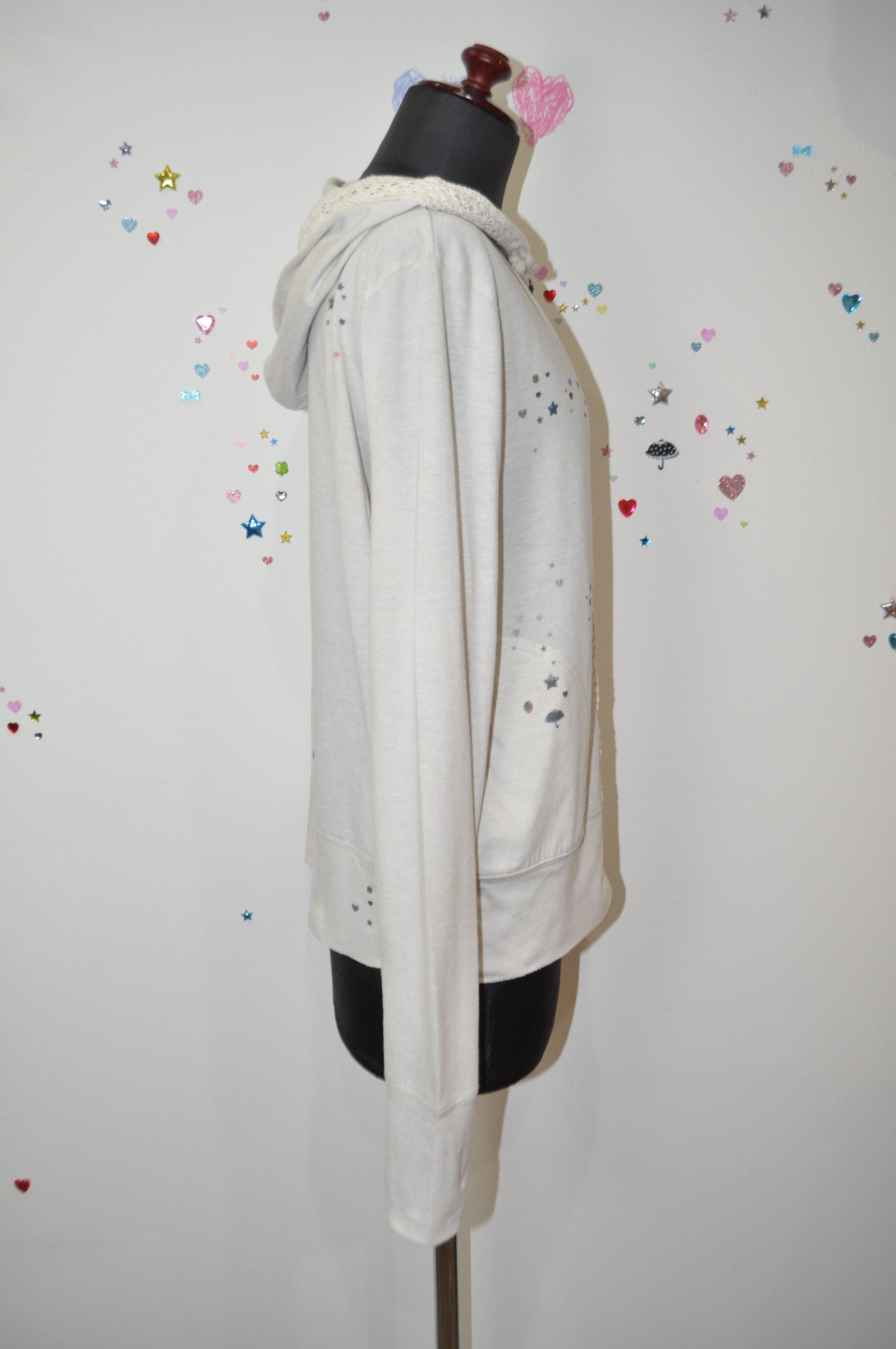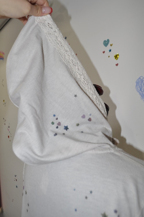 軽く羽織れる生地で、キラキラのプリントがあちこちにあるの。
