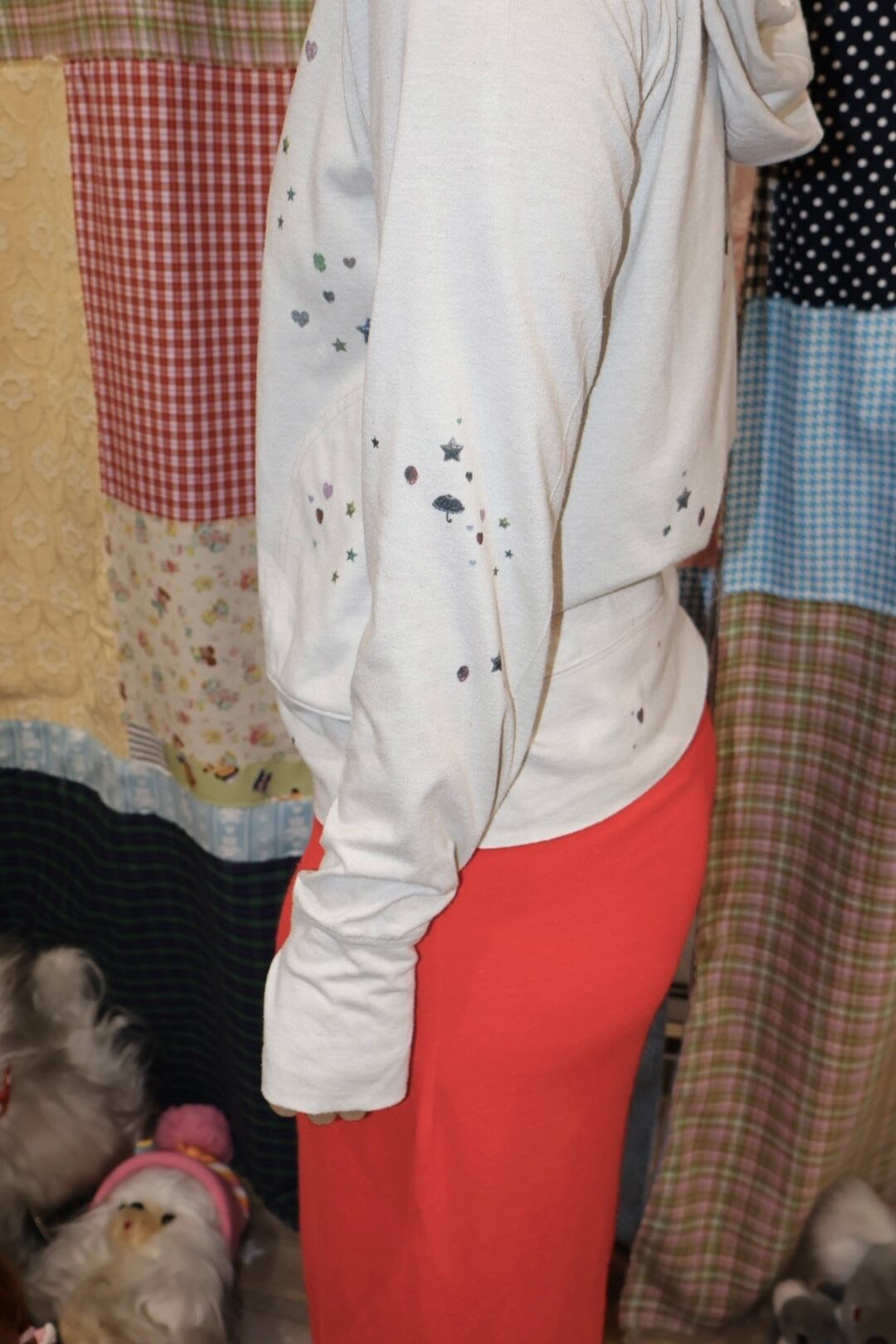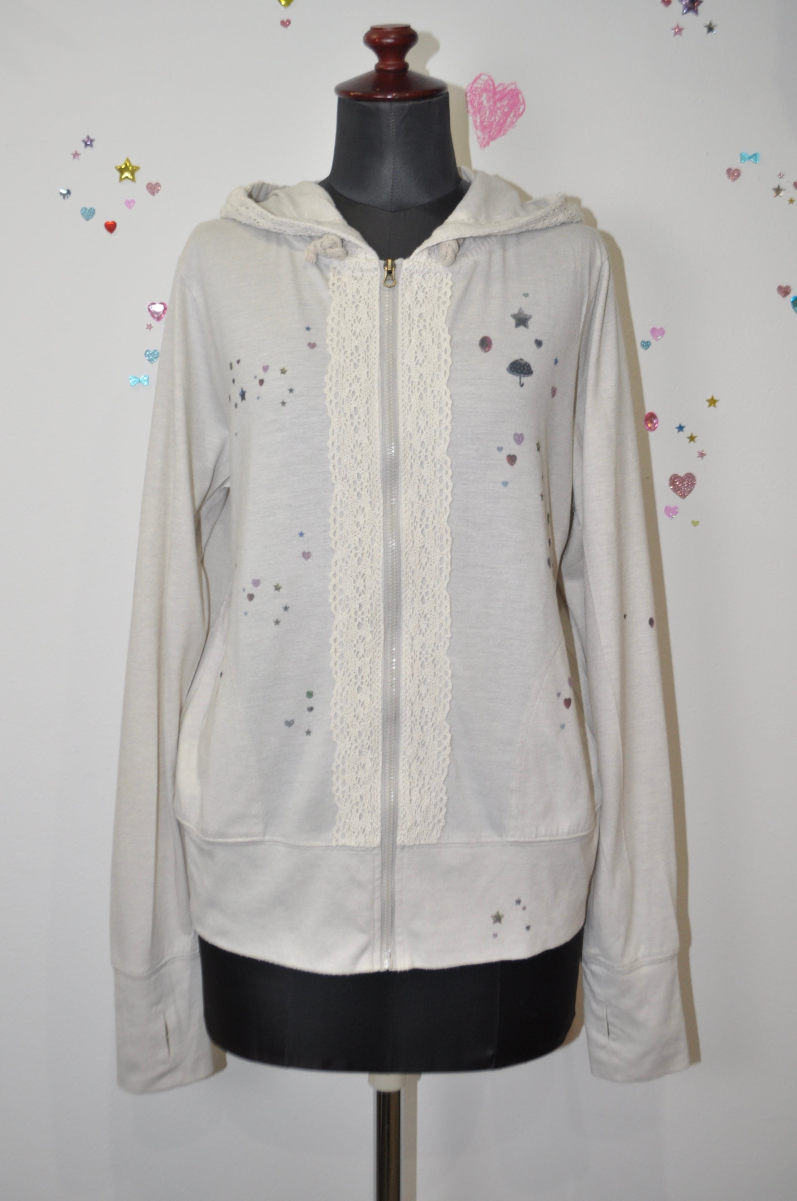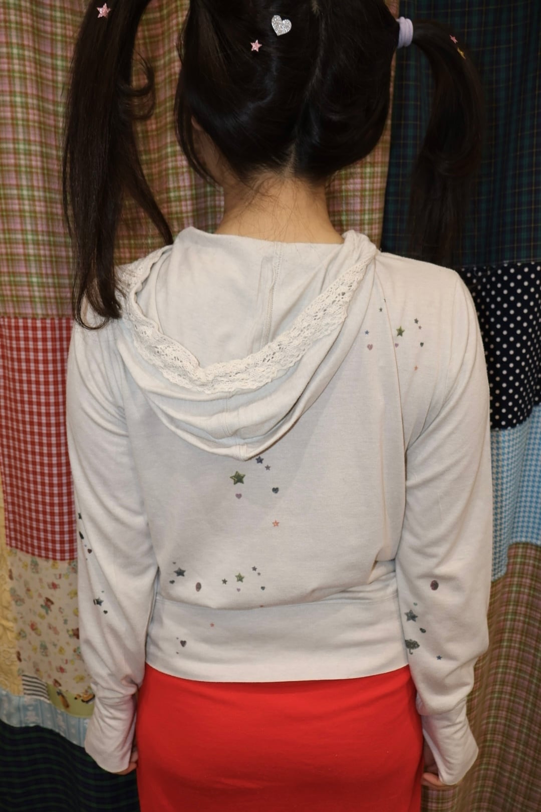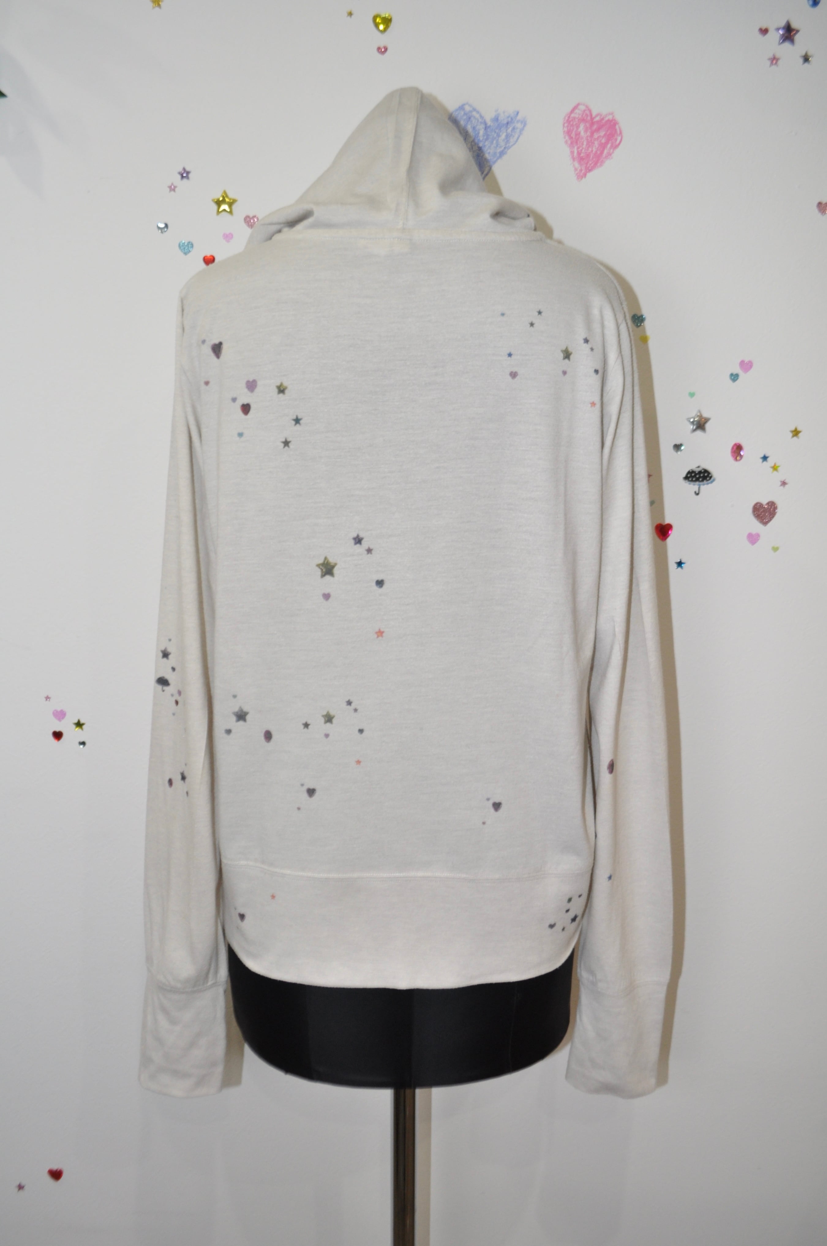 軽く羽織れる生地で、キラキラのプリントがあちこちにあるの。