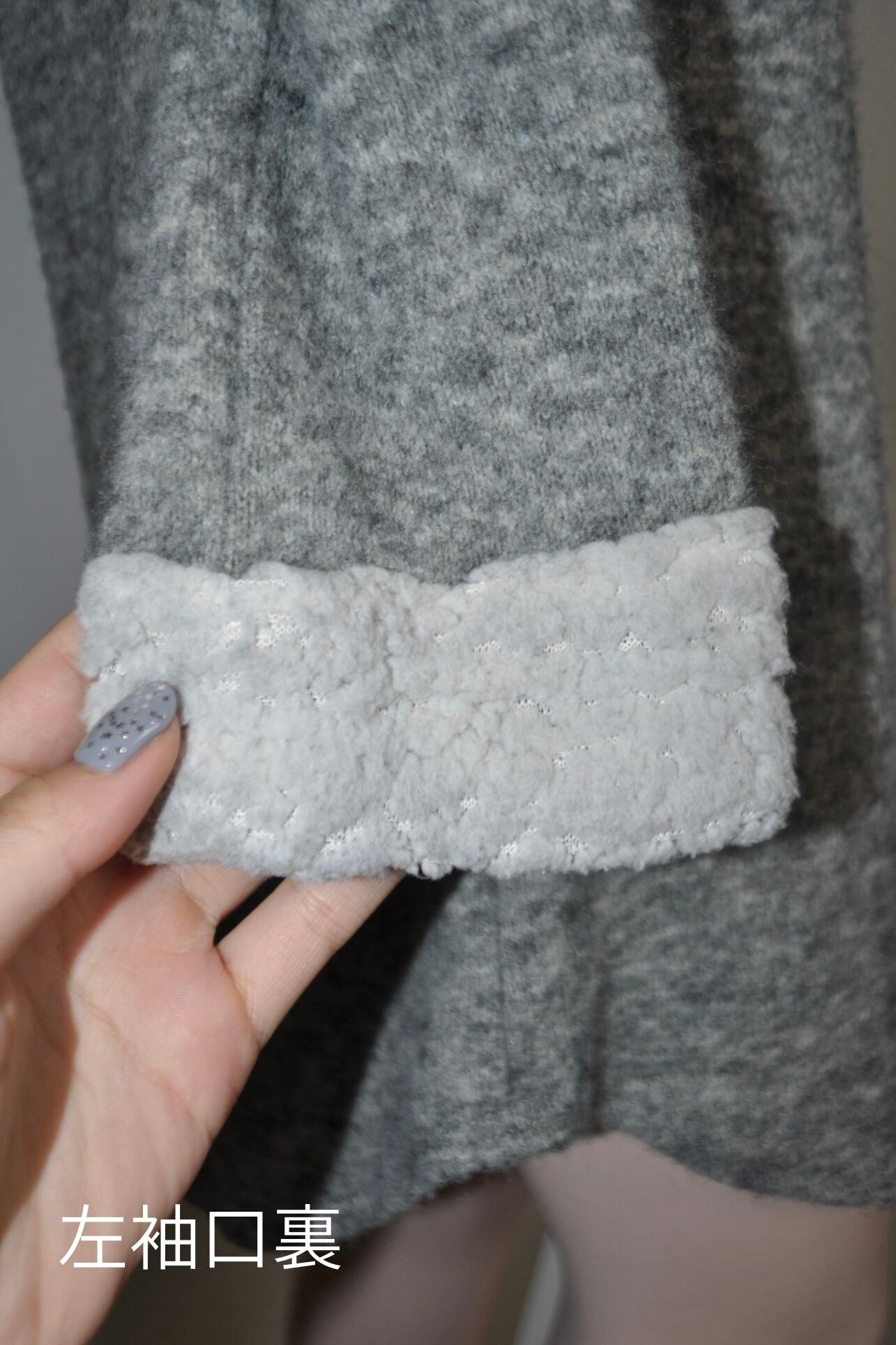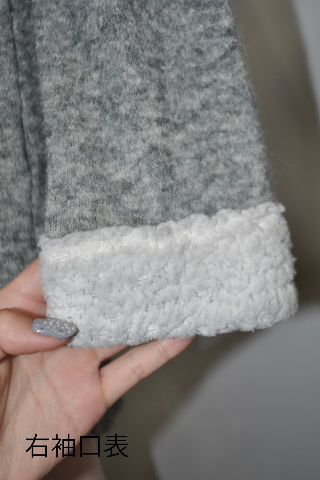 袖の白いボアがふわっとやさしくて襟は編み上げ。